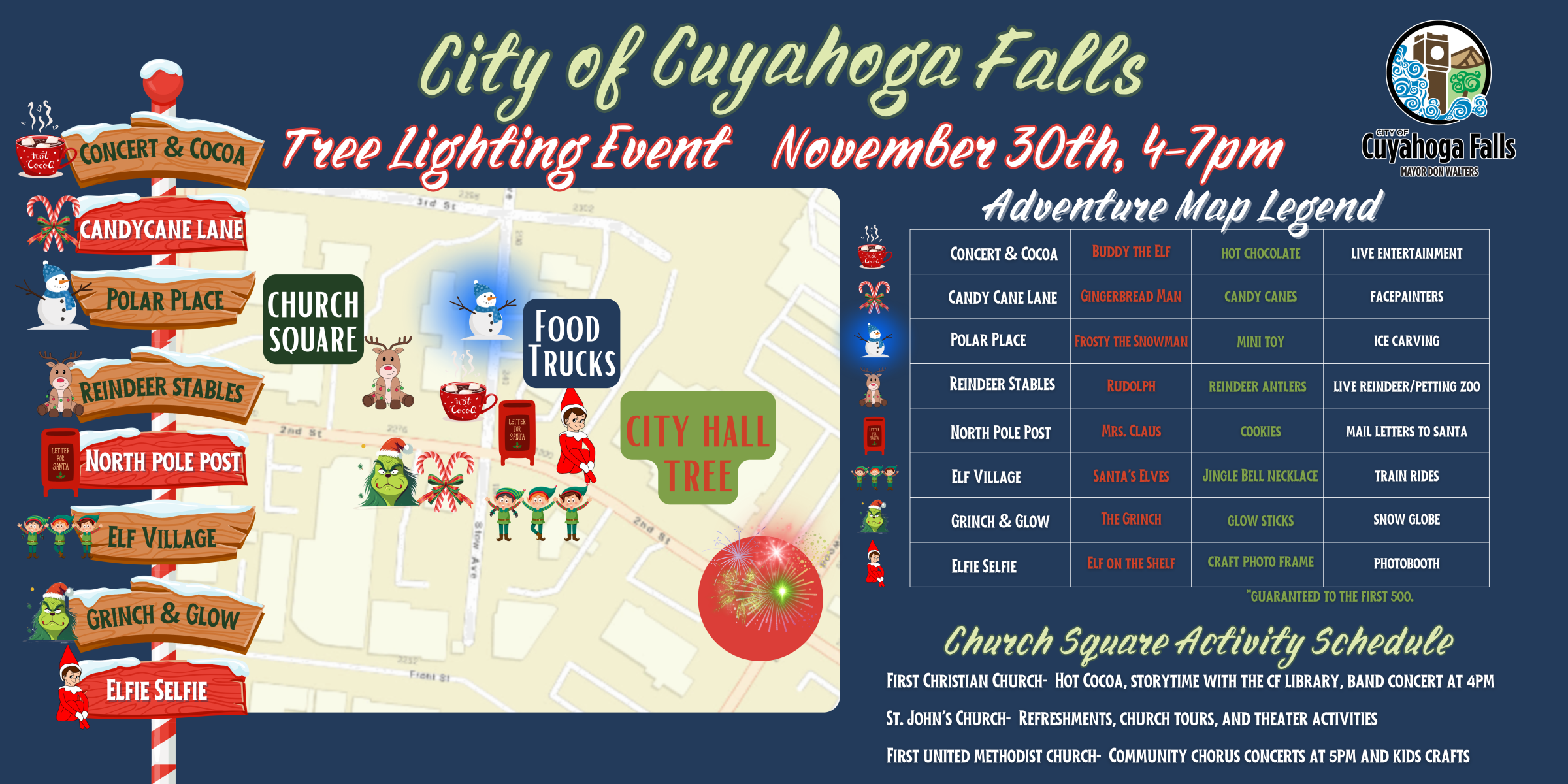 Mayor Don Walters is excited to announce that the City of Cuyahoga Falls will host the 2024 Tree Lighting Celebration on Saturday, November 30, 2024, at City Hall, 2310 Second Street.